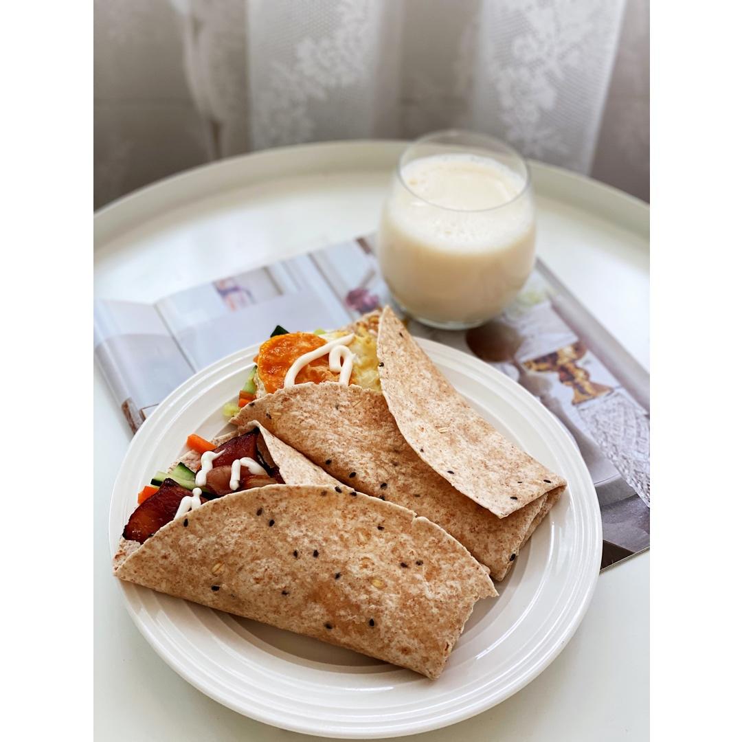 是日早餐:谷物满分卷饼(培根鸡蛋)+牛奶