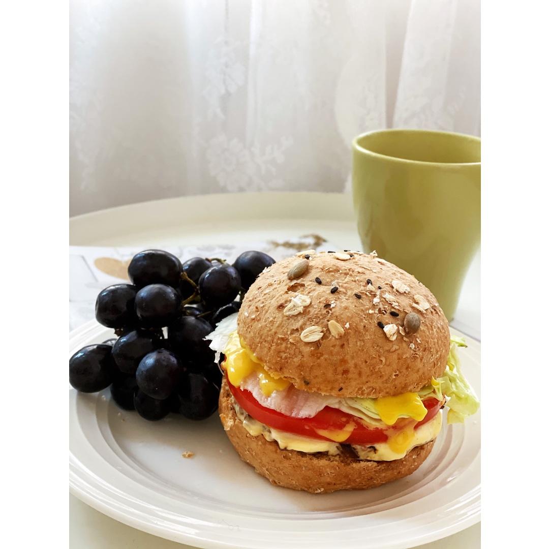 是日早餐:牛肉饼汉堡包+玫瑰黑提+奶茶