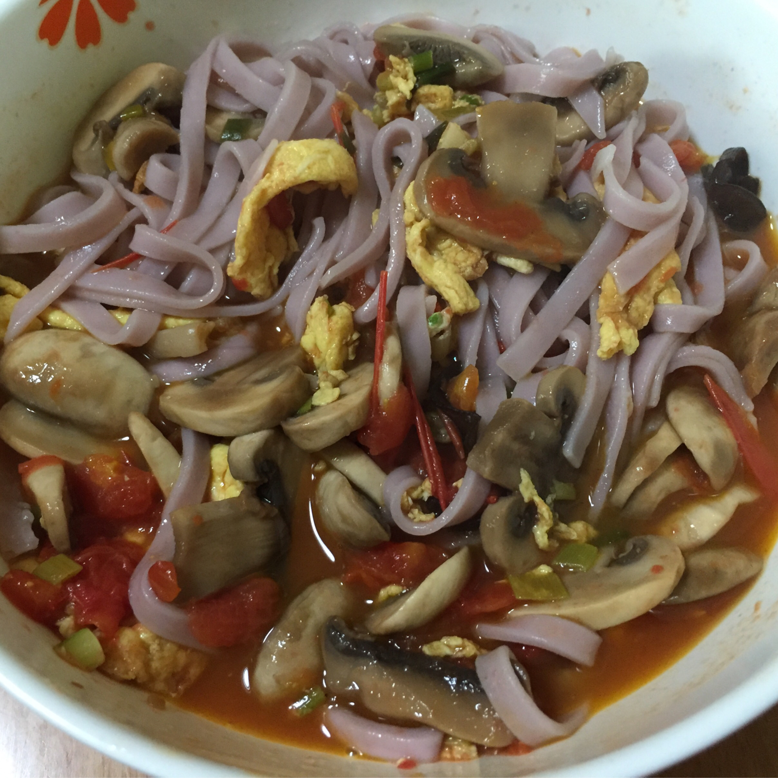 🍅鸡蛋面,加了口蘑,用紫薯和面,营养非常丰富哟!