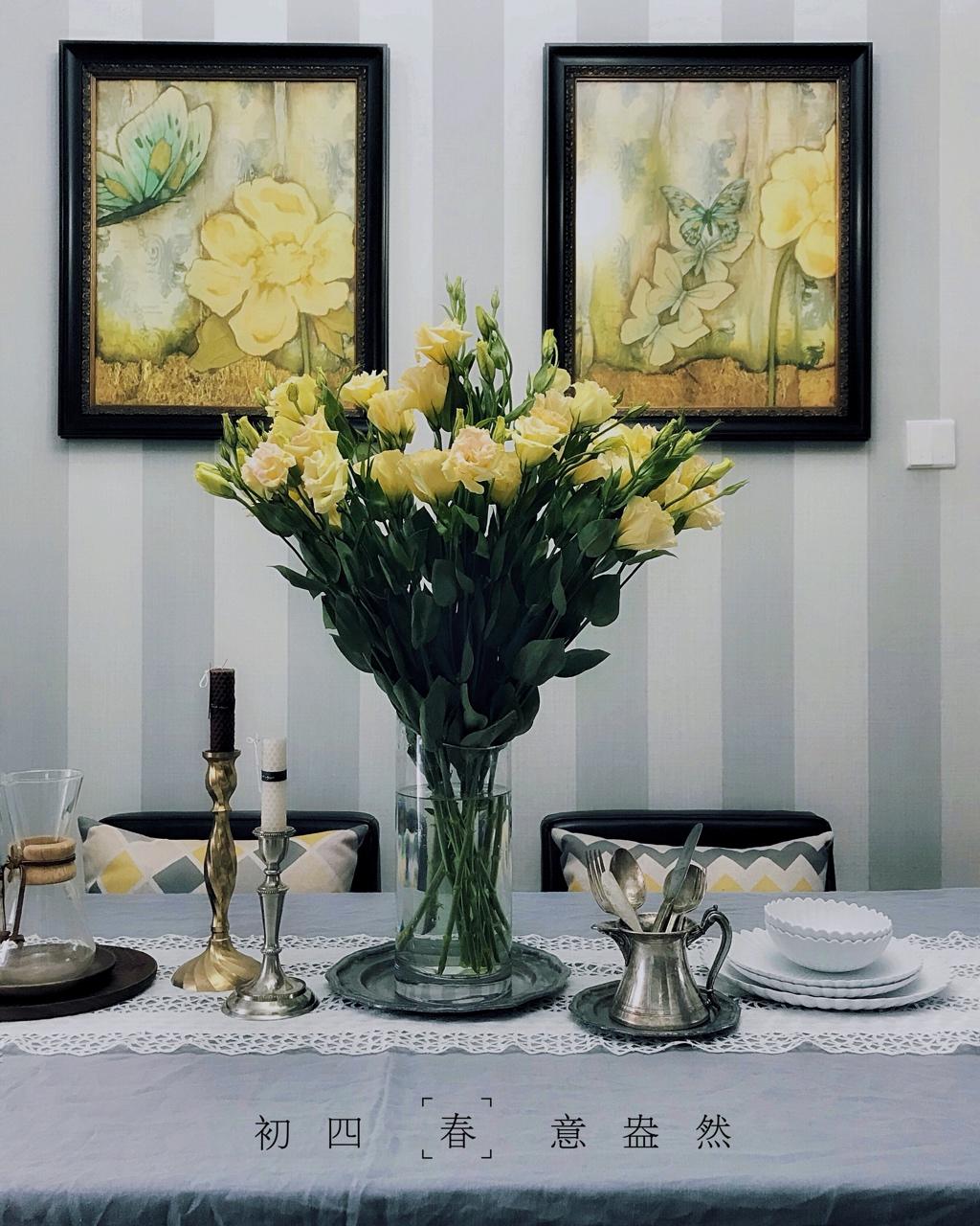 大年初四,春意盎然。一束花,就能带来春天的感觉。嫩黄色的洋桔梗摆在我的餐桌正合适,和餐厅墙上的挂画很搭,一下就满室春光了...