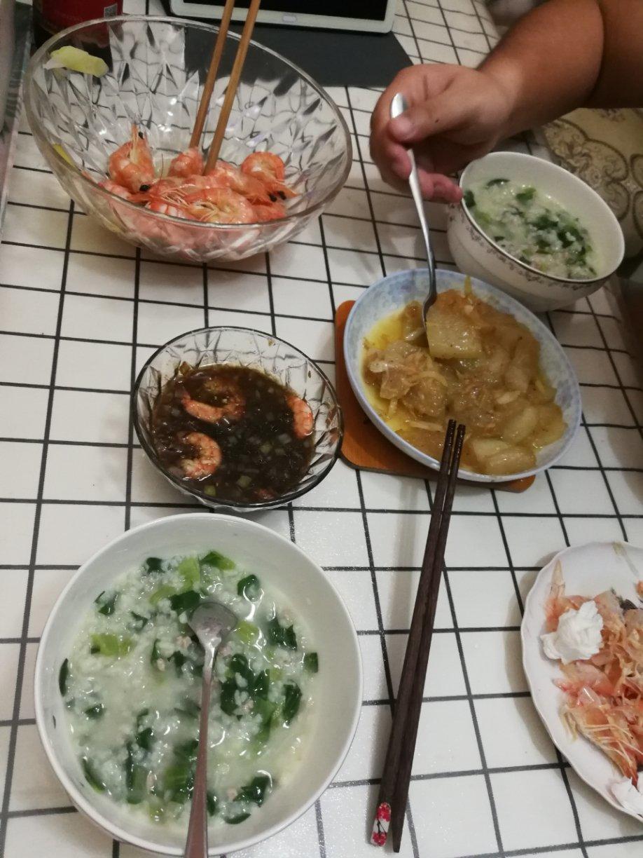 孕期不能吃皮蛋,临时换为青菜瘦肉粥,生菜煮久了会变老,肉不知何故不够嫩。
