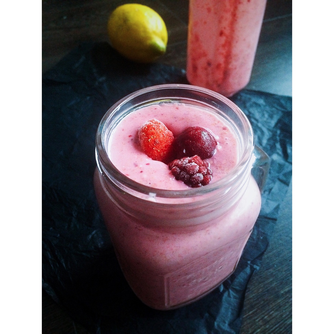 今天是香蕉+浆果+柠檬+麦片+麦麸+牛奶,超级好吃!