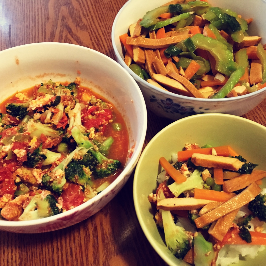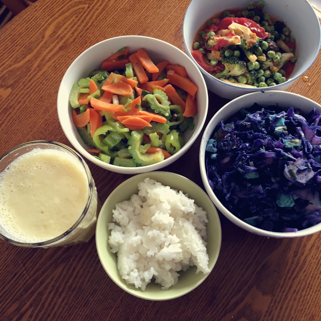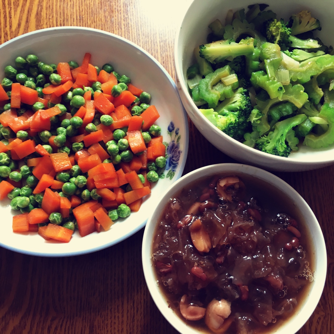 打卡,清理冰箱食材,三道混合型素菜,菠萝雪梨汁,做得有点多,明天又该去跑步了…