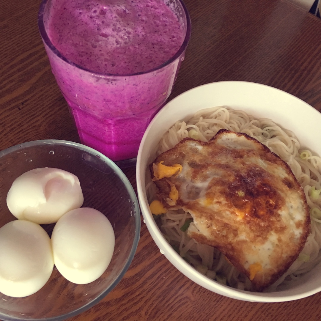 水煮蛋不都是我的,火龙果椰汁,煎鸡蛋挂面,女儿是同样小份版。周末愉快!