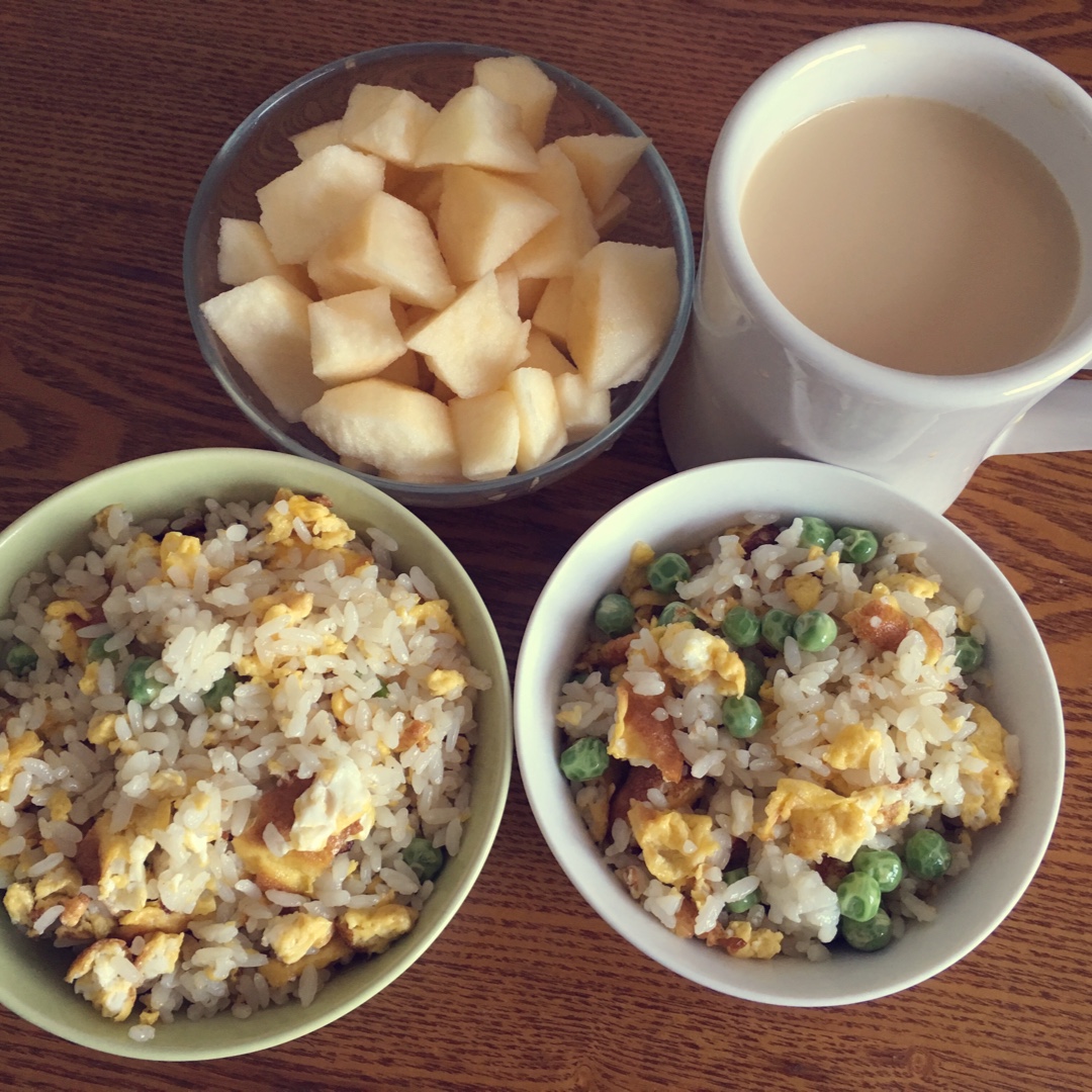 晨跑归来,豌豆鸡蛋炒饭,苹果,咖啡,女儿今天起的也很早,据说我刚出门跑步就起来了
