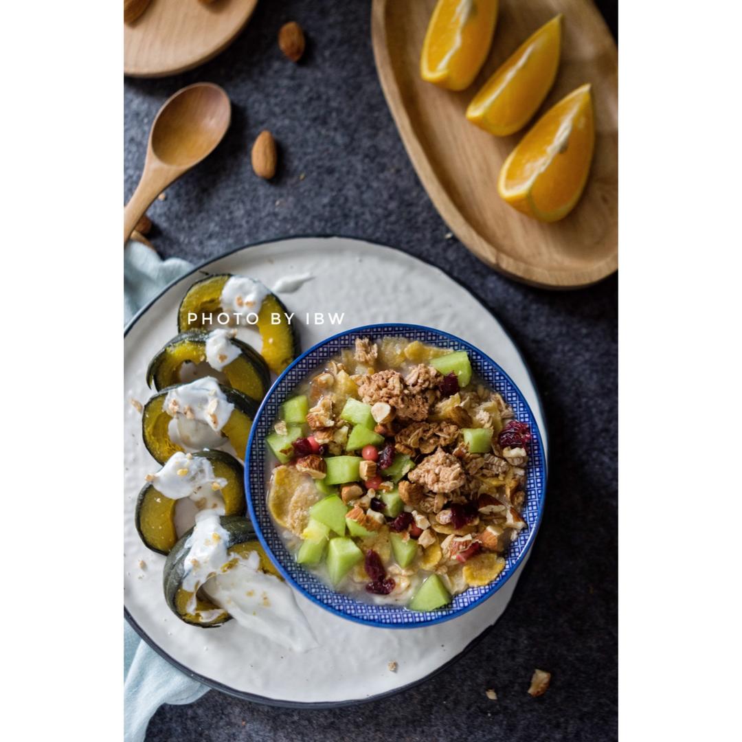 蒸nz南瓜,菠萝,蒸米糕配百香果和蜂蜜。牛奶忘记放进来了。婆婆是上海人,米糕这一类食物最得她喜欢。 #早餐•2017年5...
