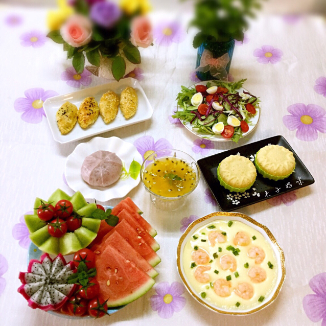 早安!周末愉快!早餐有玉米松糕,紫薯豆沙包,苹果和咖哩鸡肉酥,虾仁炖蛋,蔬菜鹌鹑蛋油醋色拉,百香果汁,水果! #早餐•2...