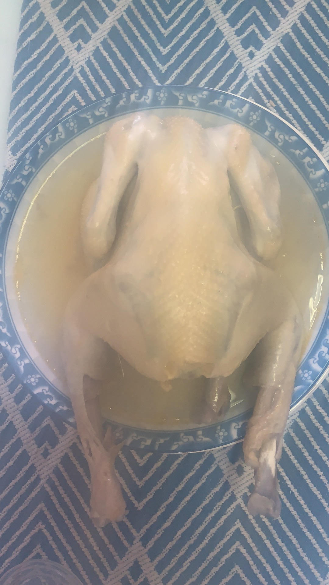 买的童子鸡,然后先用料酒葱姜泡一下血水出来,再晾干半小时,抹一两小勺盐。鸡肚子里面塞葱,开水上锅蒸,上面放姜...