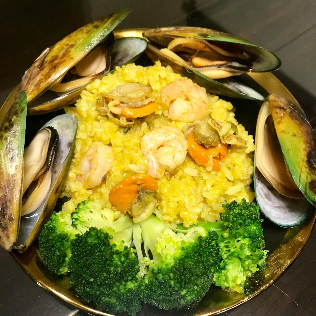 自制的一大锅海鲜烩饭来咯!自己做海鲜烩饭就是可以把喜欢的海鲜一锅烩了!大虾🍤青口贝,鱿鱼🦑三文鱼🍣都是我爱的!米饭用咖喱...