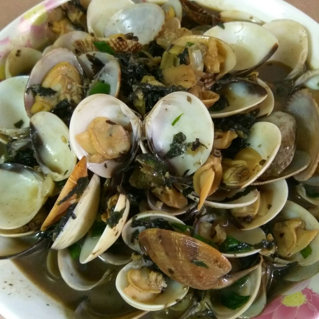蒜蓉紫苏炒花甲,萝卜干豆角炒本地黄沙蚬肉。