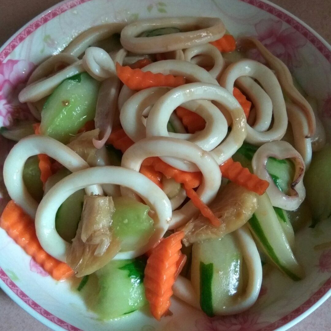 青瓜炒鱿鱼圈。Q版家族最懒的小妹交作业了,再不交作业7哥要罚我站着吃饭咯。哈哈哈哈...