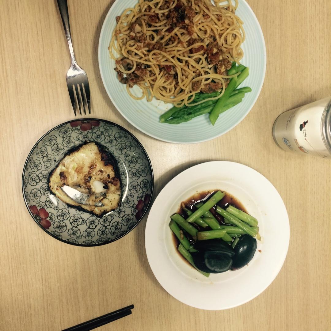 肉酱蘑菇意面,配芦笋,煎鳕鱼,牛奶。肉酱是牛肉番茄的提前熬好分小份冷冻在冰箱里的,早晨拿一份出来在冷藏。下班回来只要把蘑...