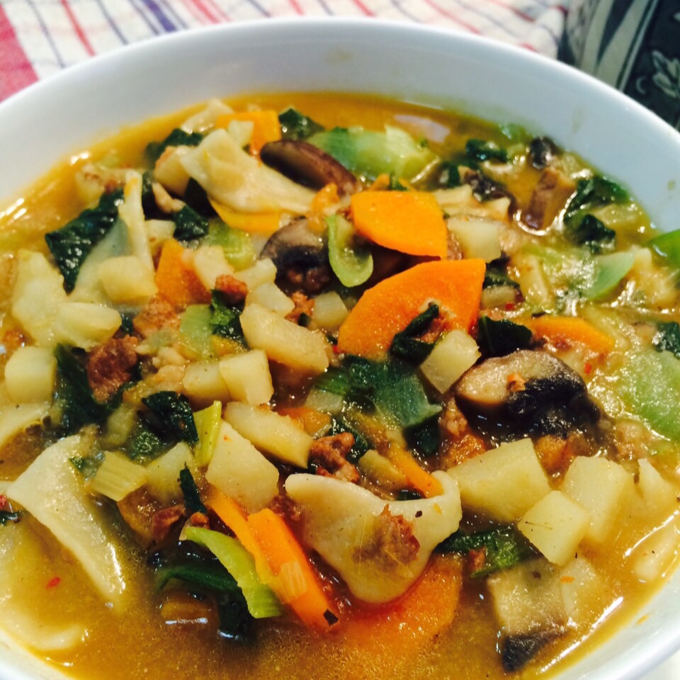 羊肉臊子小揪面。土豆,胡萝卜,口蘑,青菜,西红柿羊肉臊子烩在一起,揪面片,撒青菜碎。半小时,7种食材 #晚餐•2016年...