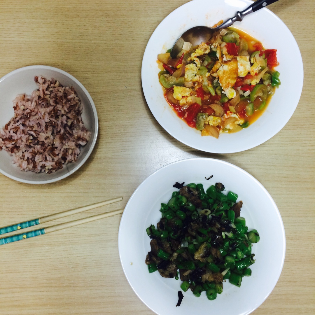 真正的快手夏季晚餐。西红柿丝瓜茄子柿子椒炒鸡蛋,橄榄菜四季豆芦笋炒肉丁,红米糙米饭。半小时,算水果12种食材。 #晚餐•...