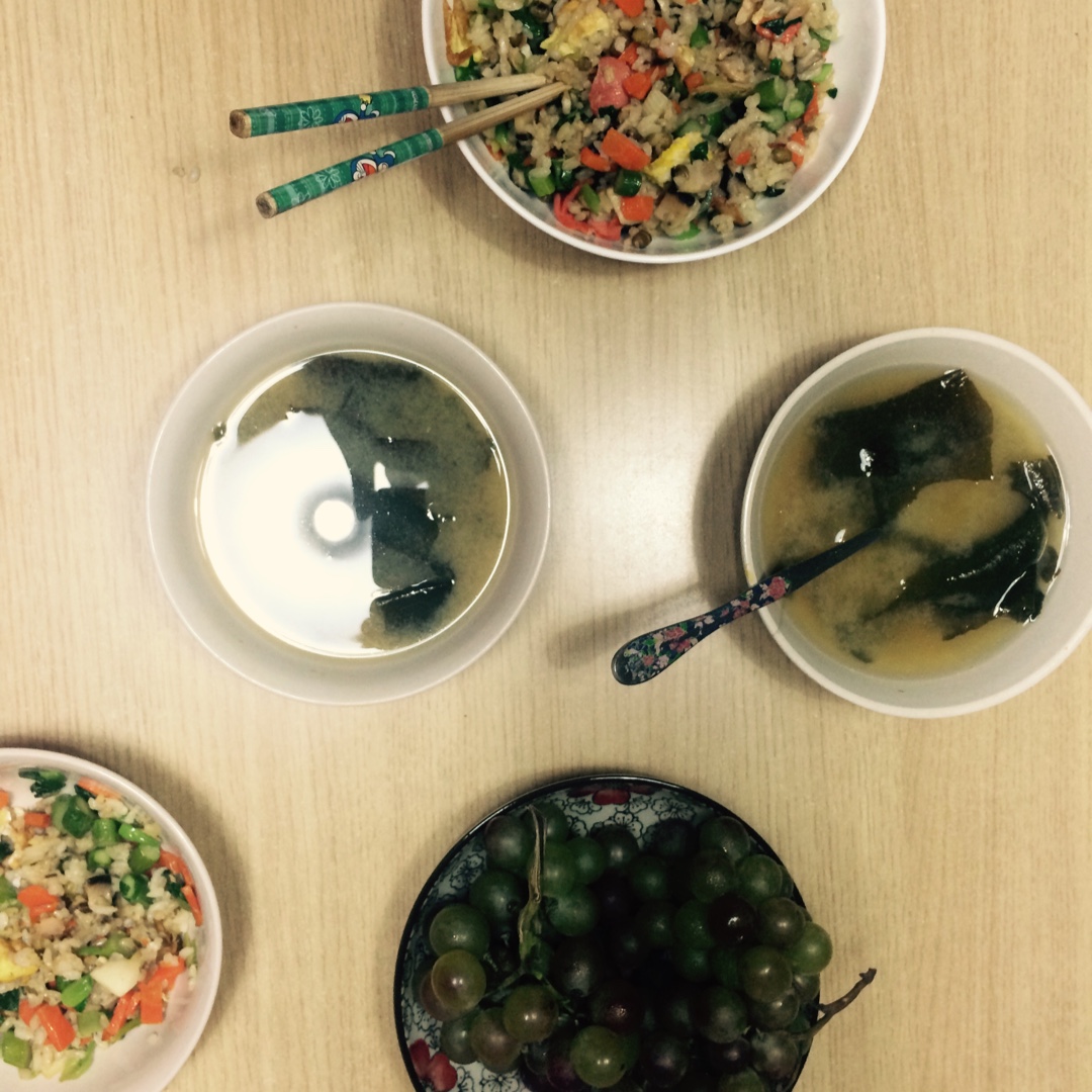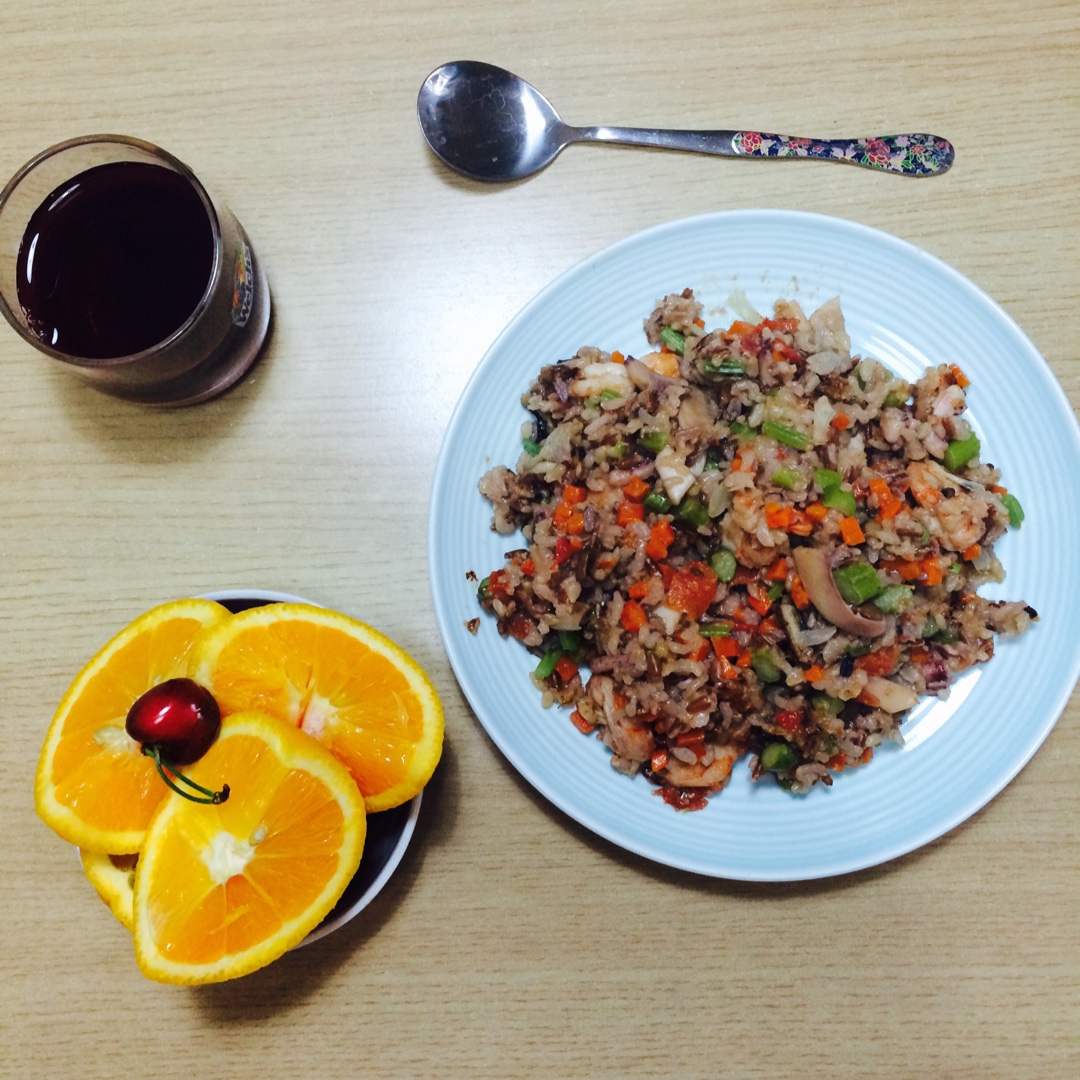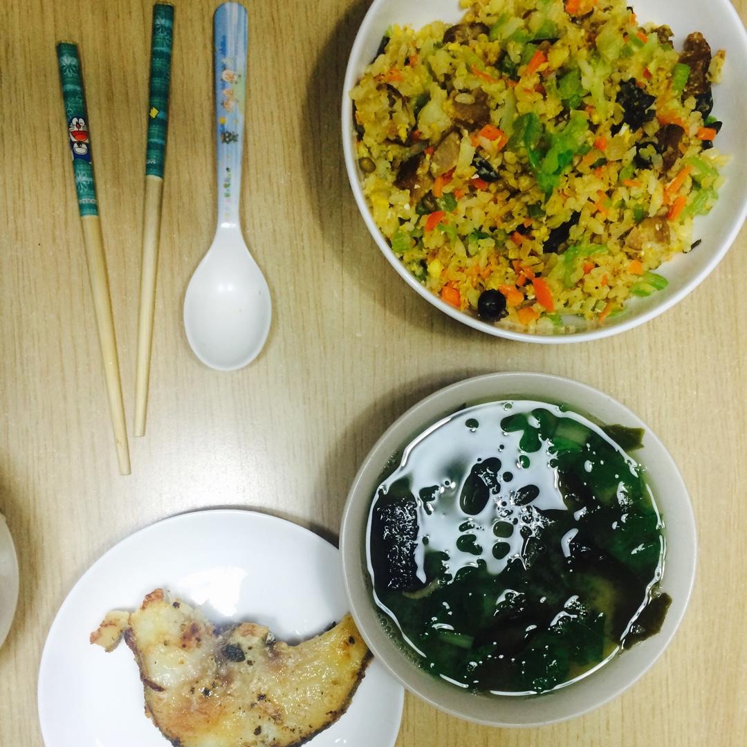 黄金牛肉蔬菜炒饭,裙带菜海米青菜汤,香煎鳕鱼。牛肉,芹菜,洋葱,胡萝卜,香菇,木耳切丁,圆白菜切丝,绿豆糙米饭炒在一起,...
