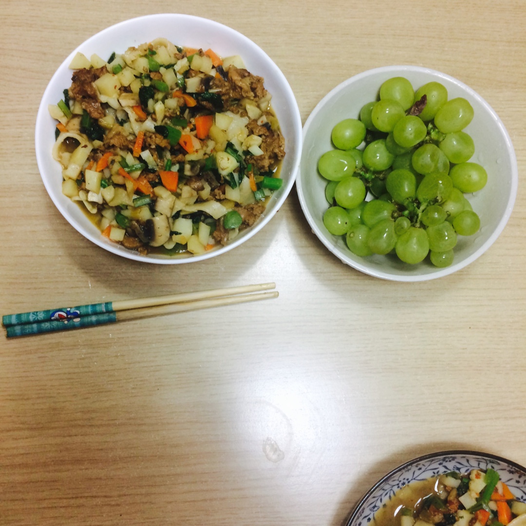 羊肉臊子面,土豆丁胡萝卜丁口蘑顶菜心,手擀面,一小时,加水果7种食材。炒臊子费时,一次多炒些出来,以后下班回来只要准备菜...