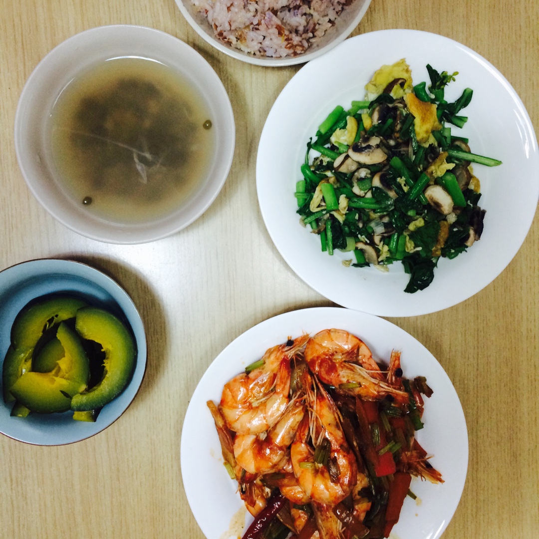 周三放学照例孩子游泳训练,需要高蛋白低脂肪。家常焖大虾(胡萝卜芹菜洋葱),青菜心鸡蛋炒口蘑,冰镇绿豆薏米百合水,南瓜,糙...