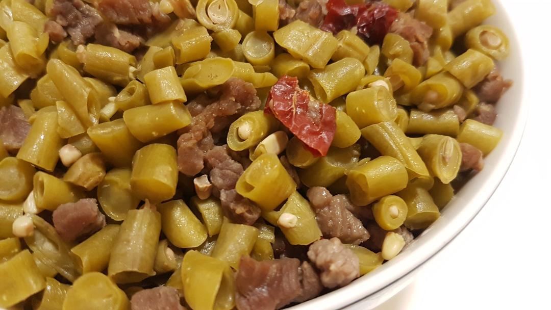 这一缸酸豆角腌了一个月,超级酸,口舌生津!炒了牛肉末,大碗大满...