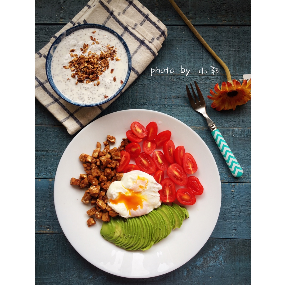 天贝用小火煎香切成小颗粒,用一点点青芥辣和酱油腌制十分钟,切牛油果、切红圣,煮个溏心水...