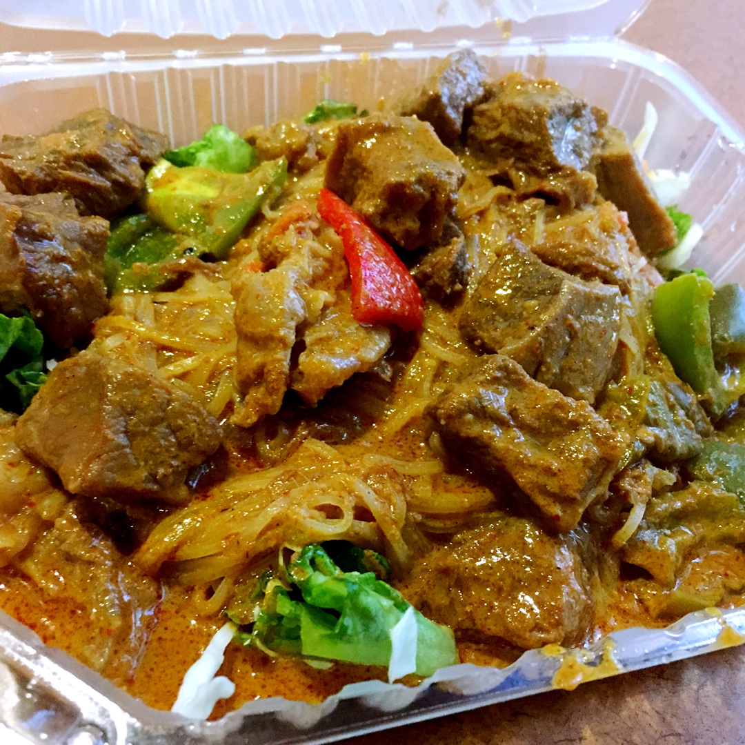 咖喱牛肉粉。在校内泰国餐厅,快打烊的时候量尤其大。8美元够我三顿。