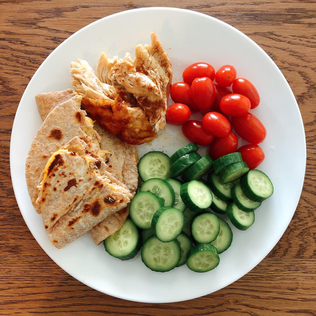 全麦墨西哥饼夹三文鱼起司+烤鸡胸肉+黄瓜+小番茄