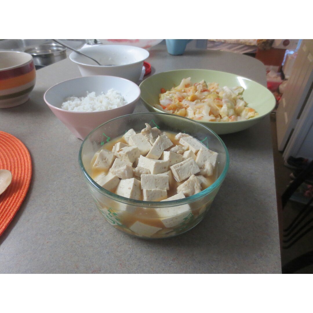 蒜香鸡肉烧豆腐。没有葱花卖相一般啦。豆瓣酱,糖和盐,味道棒棒的*^O^*
