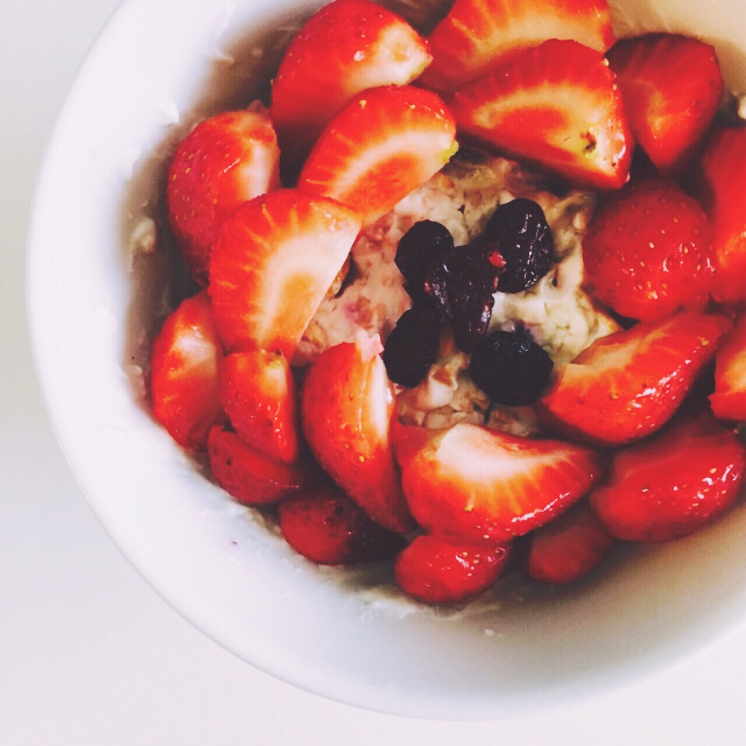 神节约时间的overnight oatmeal 搭配了草莓和最后一点红豆 幸福啊(:3 边吃边做回家作业😂 #早餐•20...