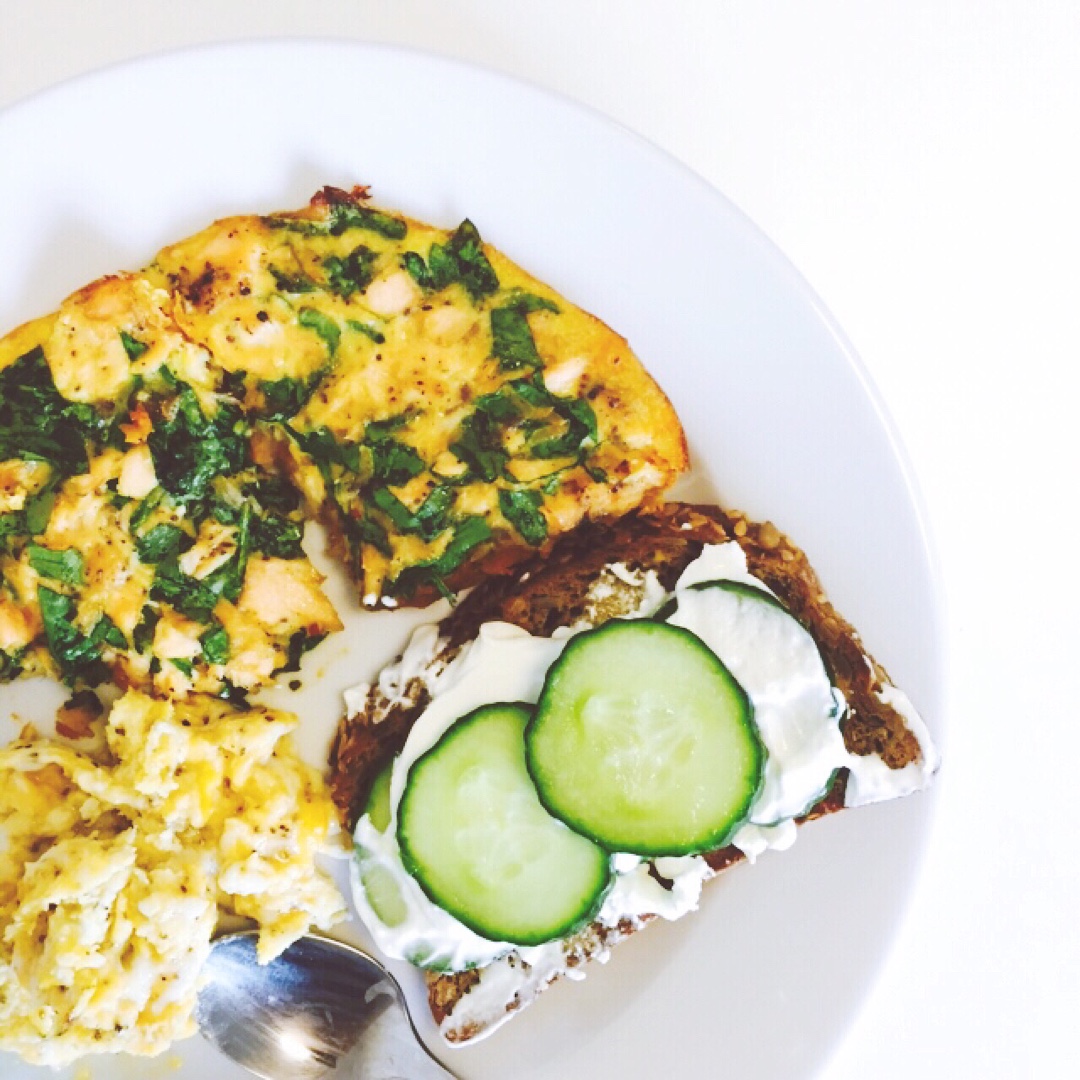 还是鸡蛋菠菜三文鱼红薯饼(:3 配了德国黑麦面包加希腊酸奶黄瓜和一个scrammed egg 早安☀️☀️☀️ #早餐•...
