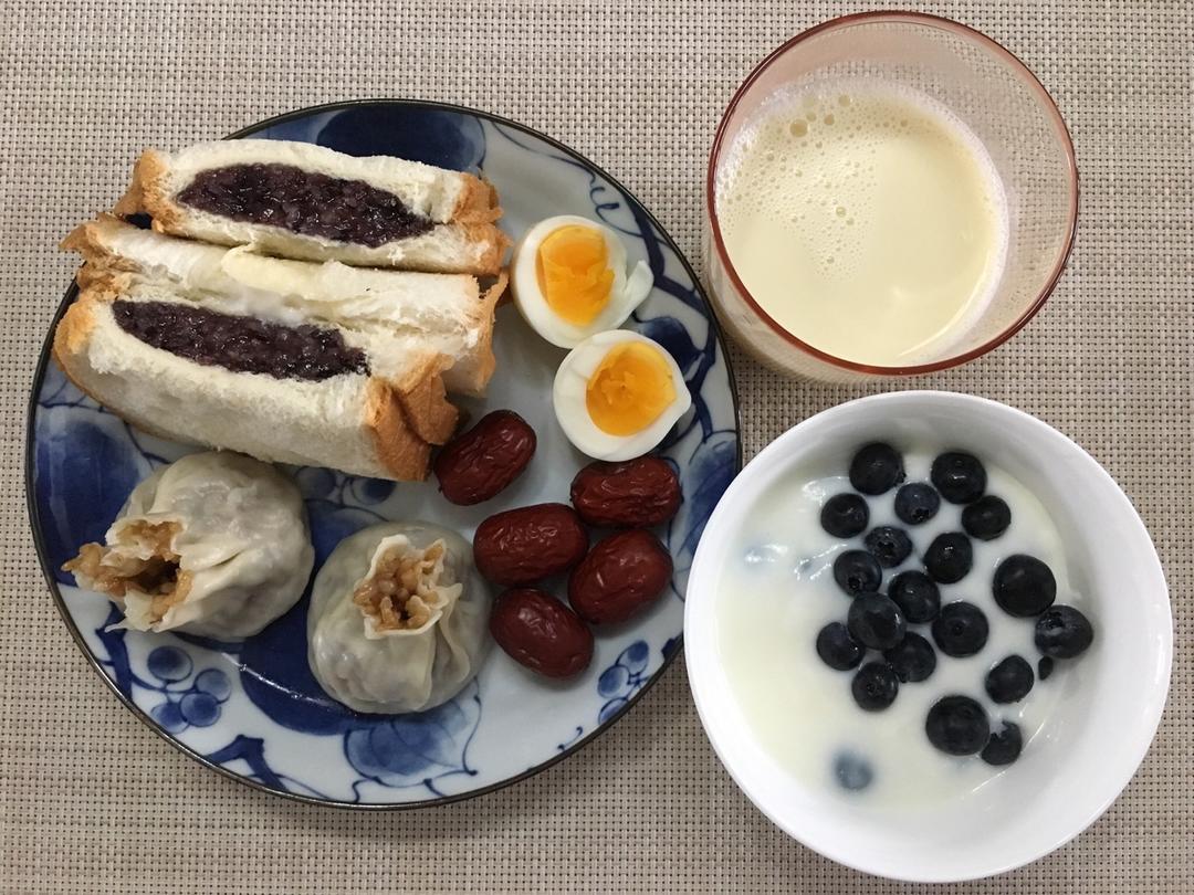 紫米面包 糯米烧卖 鸡蛋 红枣 蓝莓酸奶 甜豆浆