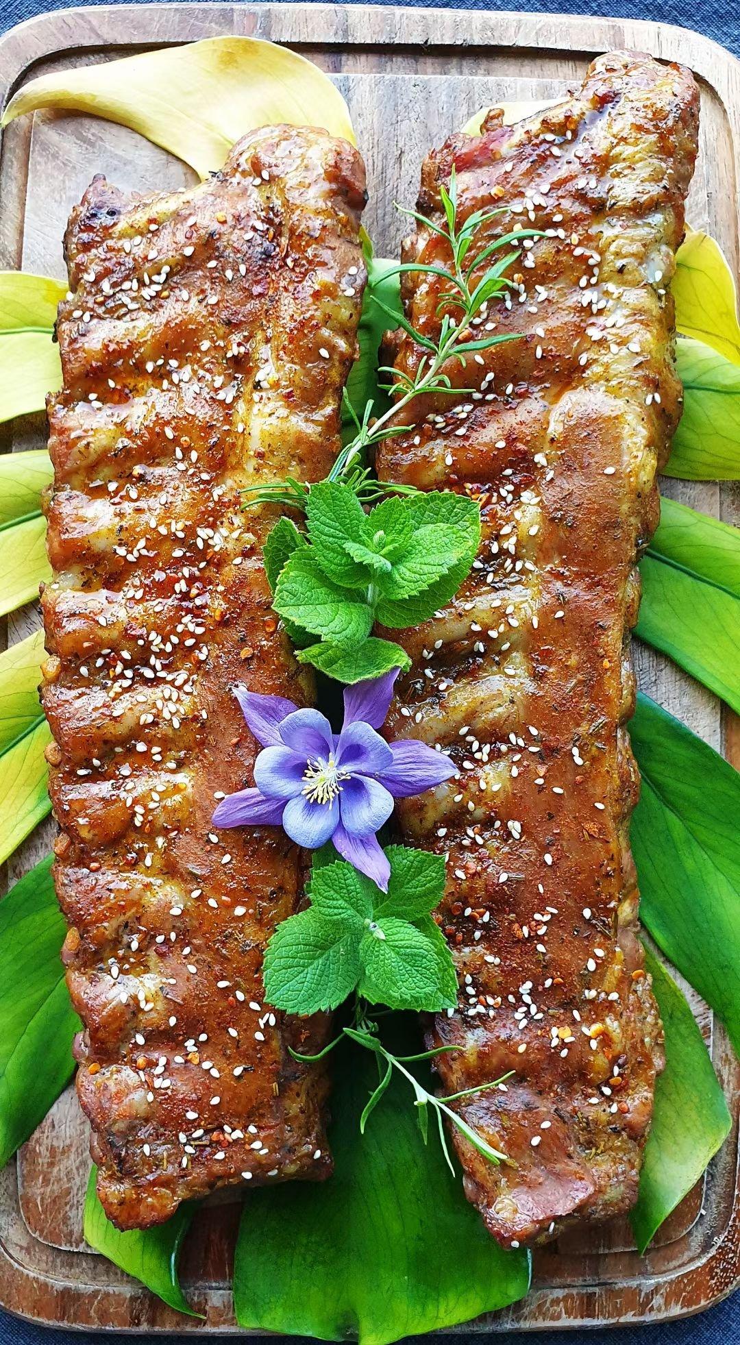 菠萝红酒烤猪肋排。