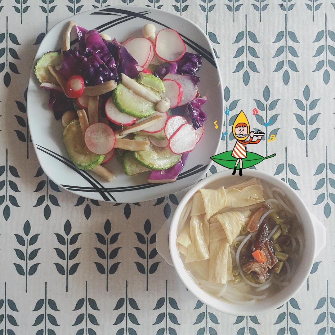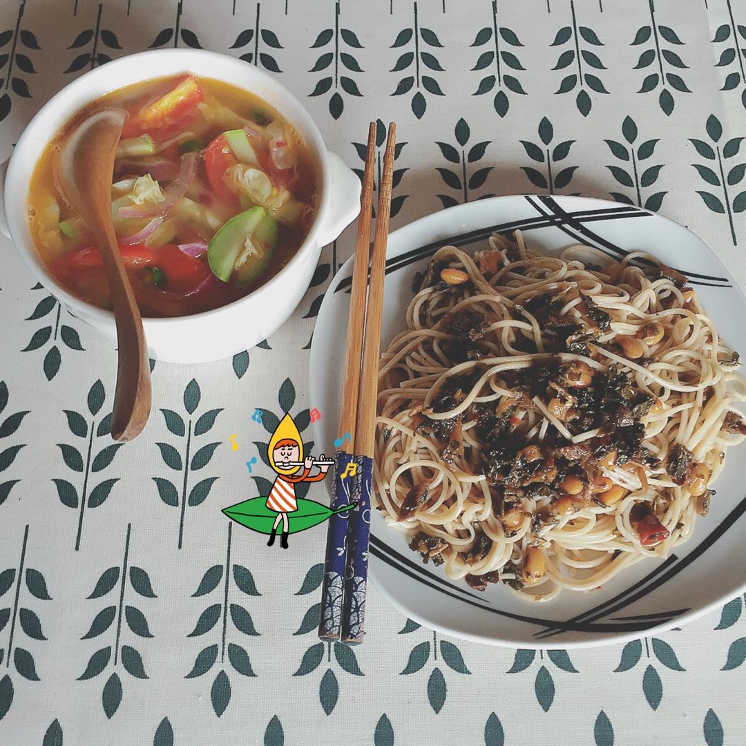 蔬菜汤,黄豆焖梅干菜拌面