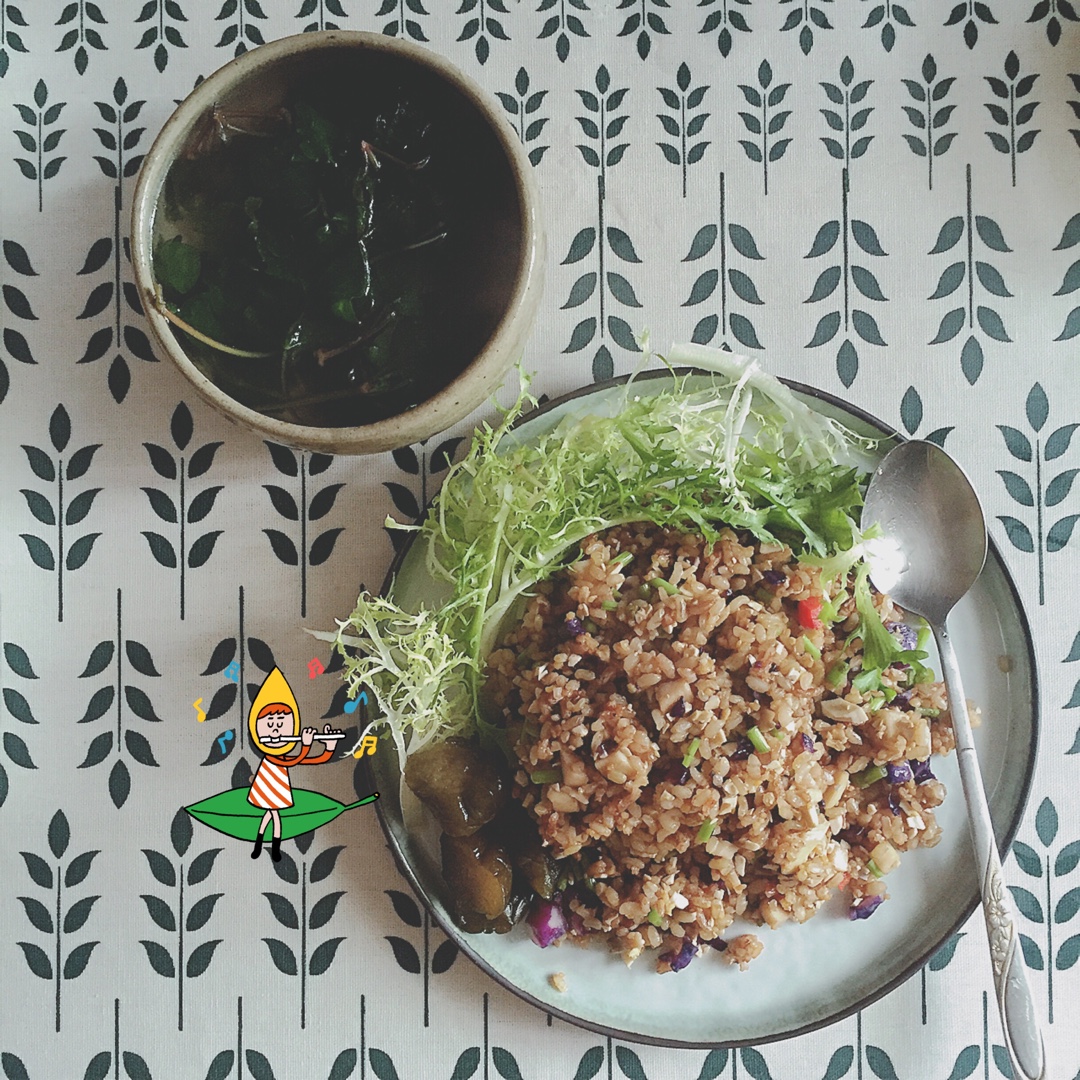 杏鲍菇炒米炒饭,枸杞叶蔬菜汤