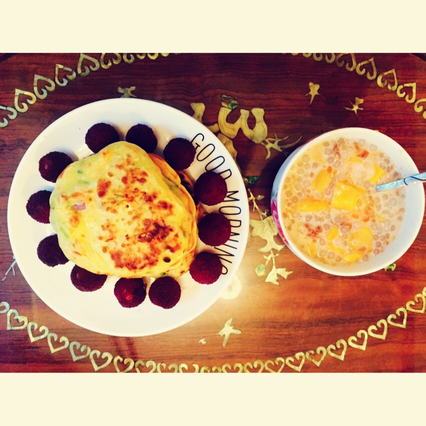 今早老公要喝中药前吃早餐,所以速成早餐了。恰好昨晚留下一碗饭,就加了鸡蛋、韭菜、火腿肠煎好,豆浆机打了一扎玉米南瓜山药牛...