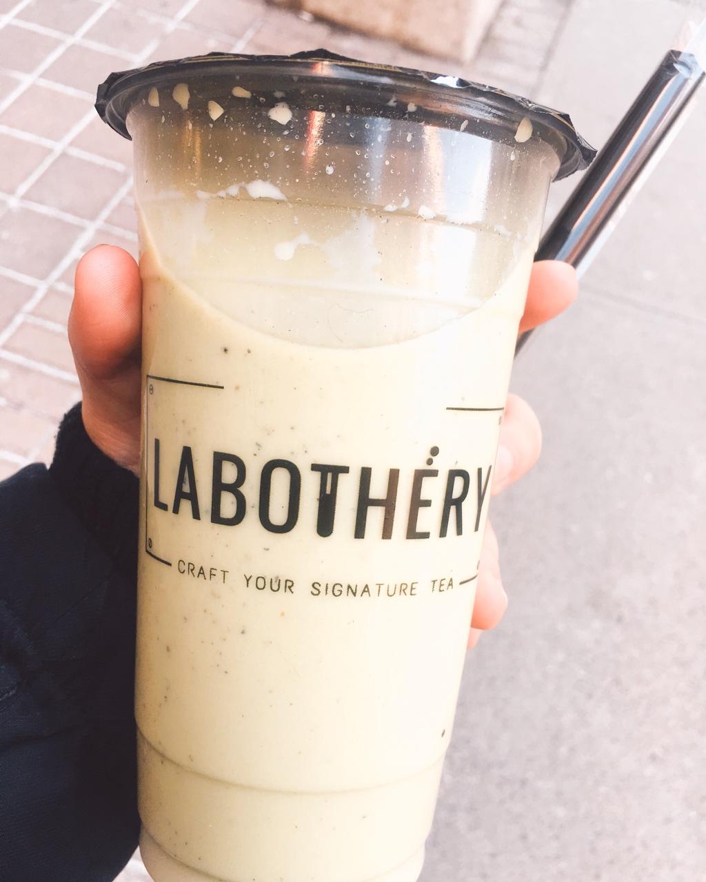 在实验室买了杯奶茶。哈哈哈哈哈,抹茶芝麻味
