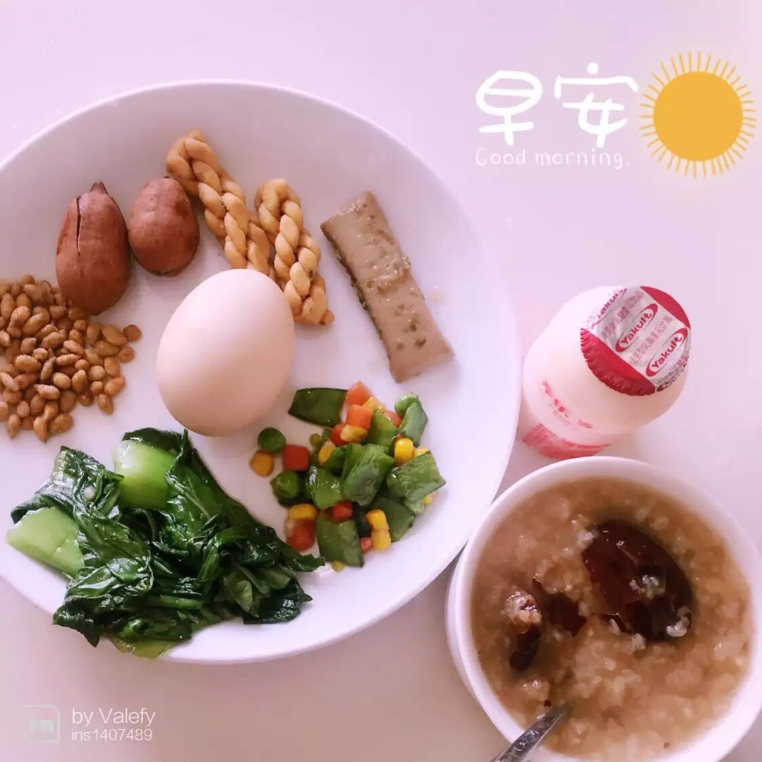 红枣粥➕酸奶➕青菜➕水煮蛋➕麻花
