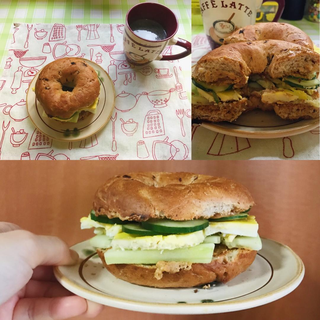 貝果三明治--花生醬+蒸蛋+🥒
