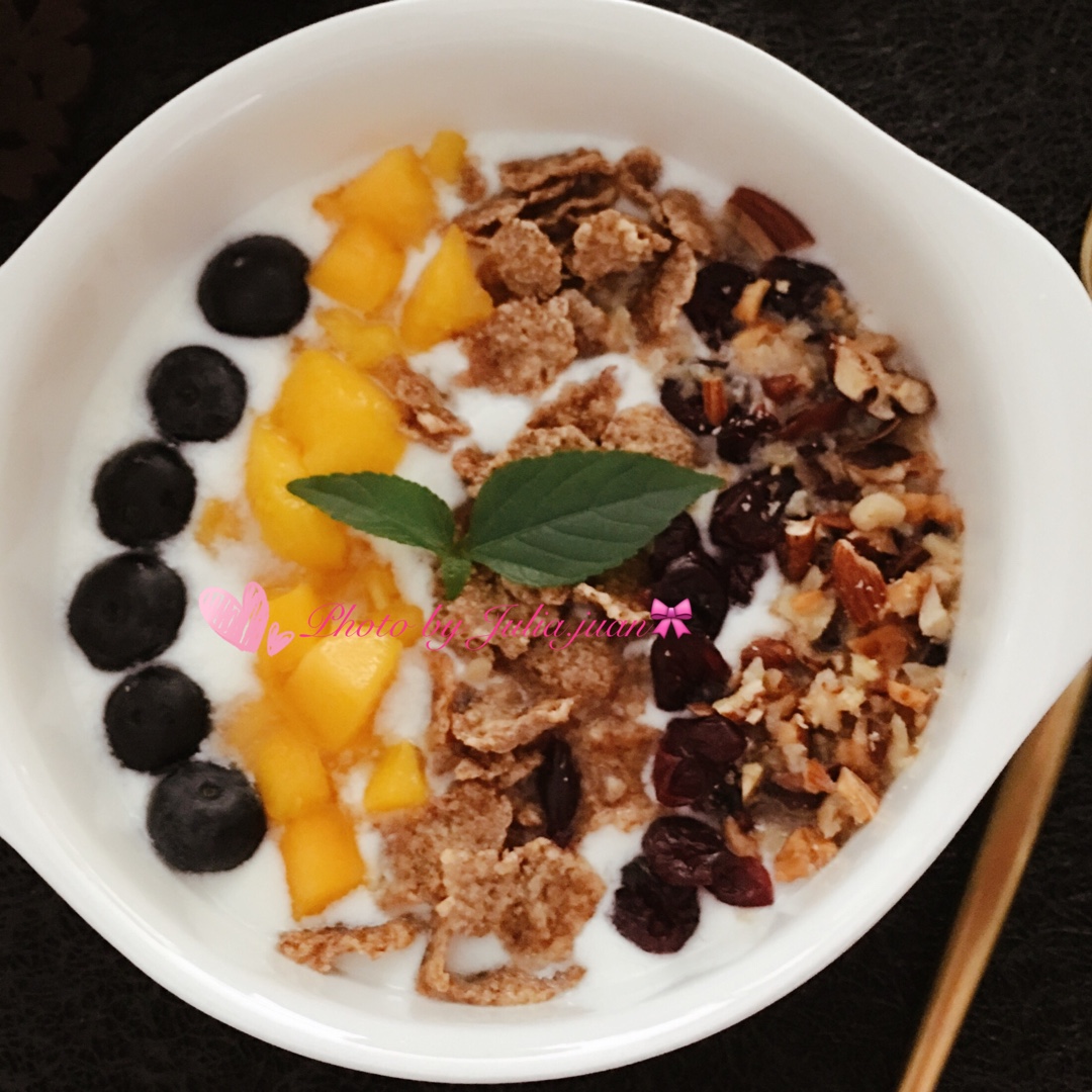 倒入樱桃口味酸奶,加蓝莓、干果碎t...