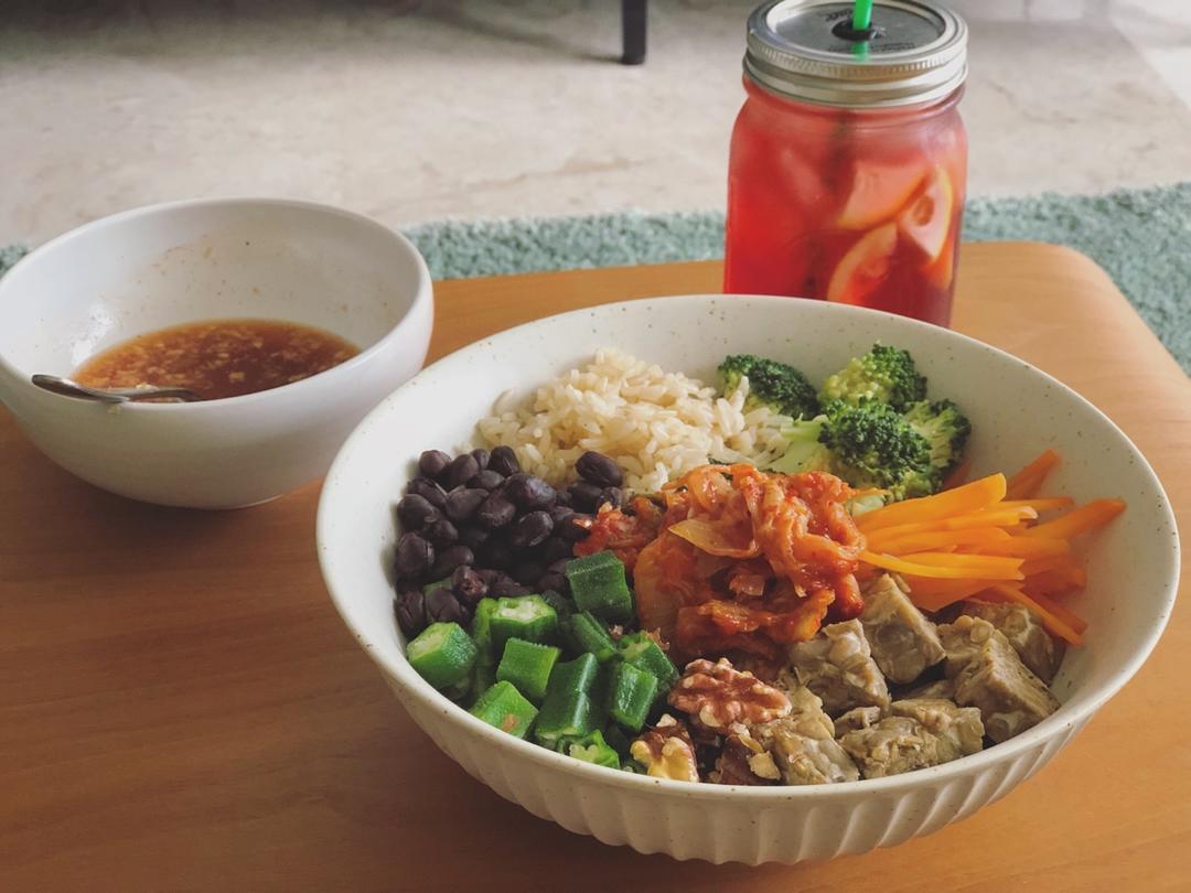 今天的午餐,蒸天贝,糙米饭,红豆和各种蔬菜的一碗端,调了个苹果醋,蒜,蜂蜜,是拉差辣椒酱的酱汁来拌,蒸天贝的味道…还是有...