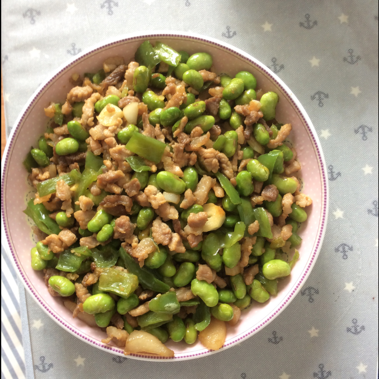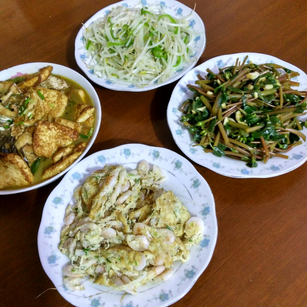 凉拌马龇苋,白米虾炒鸡蛋,青椒绿豆芽,豆腐红烧子鱼。