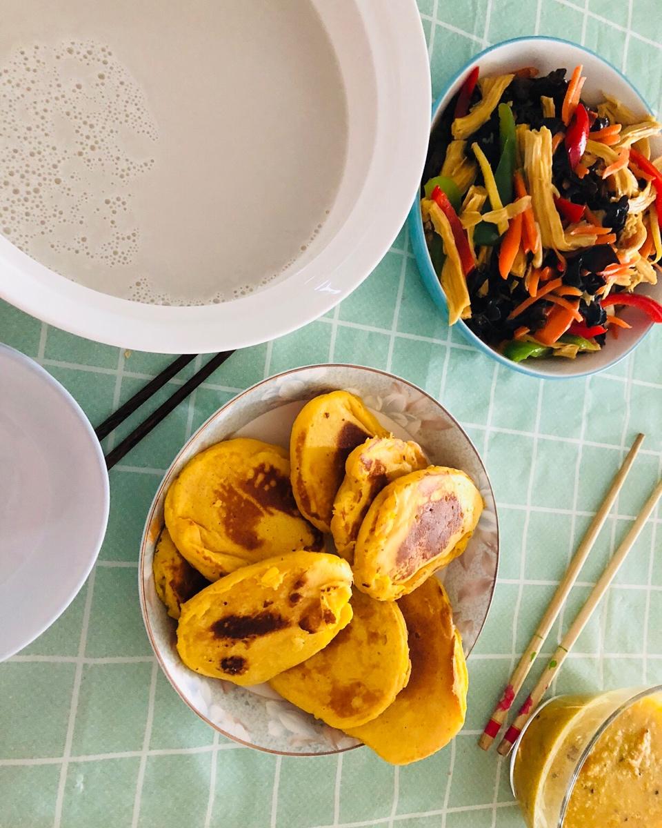 红豆粥,玉米饼,摊鸡🐔蛋,炒三丁。简单的