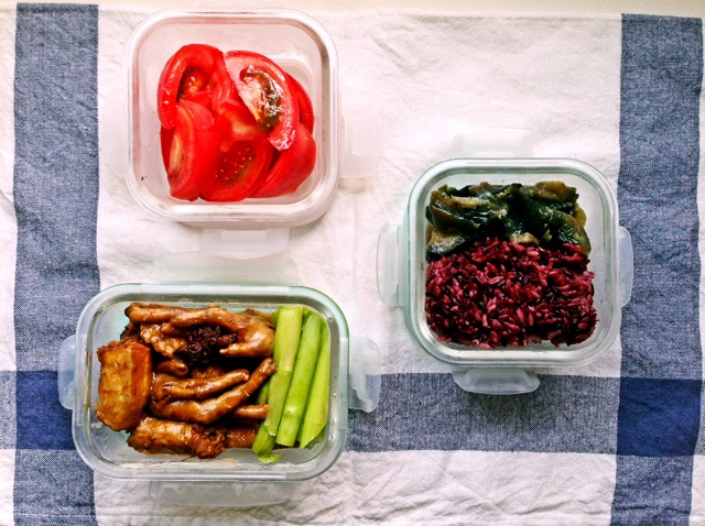 午餐:凉拌西红柿 烧鸡爪 杂粮米饭 茄子