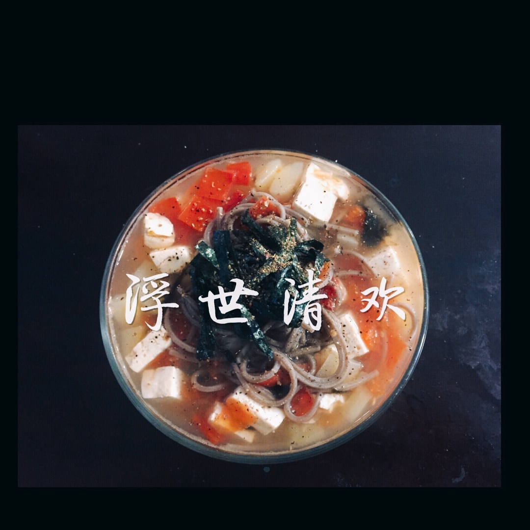 蕃茄西葫蘆豆腐蕎麥麵,370卡真是特別飽腹,而且好吃。最近莫名其妙就瘦下來了,明明中午吃一堆bagel啊,也許是天天夜裡...
