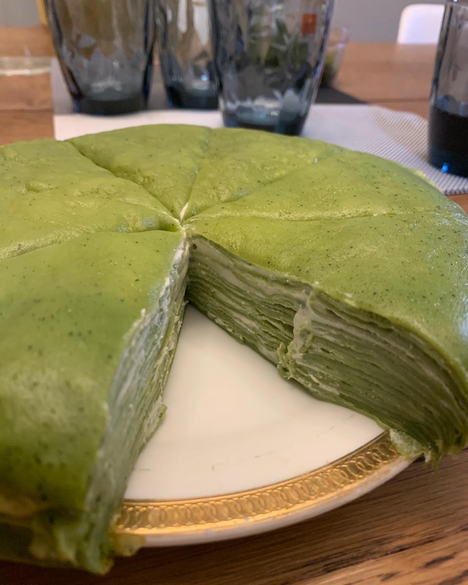 一点装饰都没加的纯抹茶千层,简简单单才是真。推荐这个配方,注意事项都标注出来了,面糊很细腻,成功率很高。#午餐•2019...