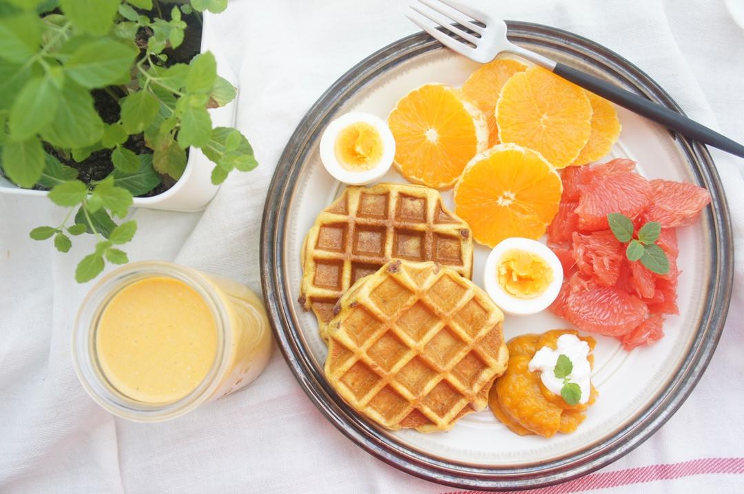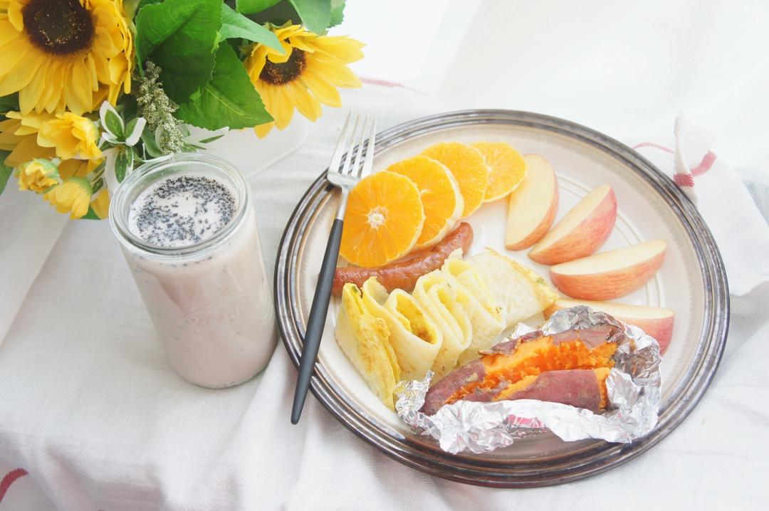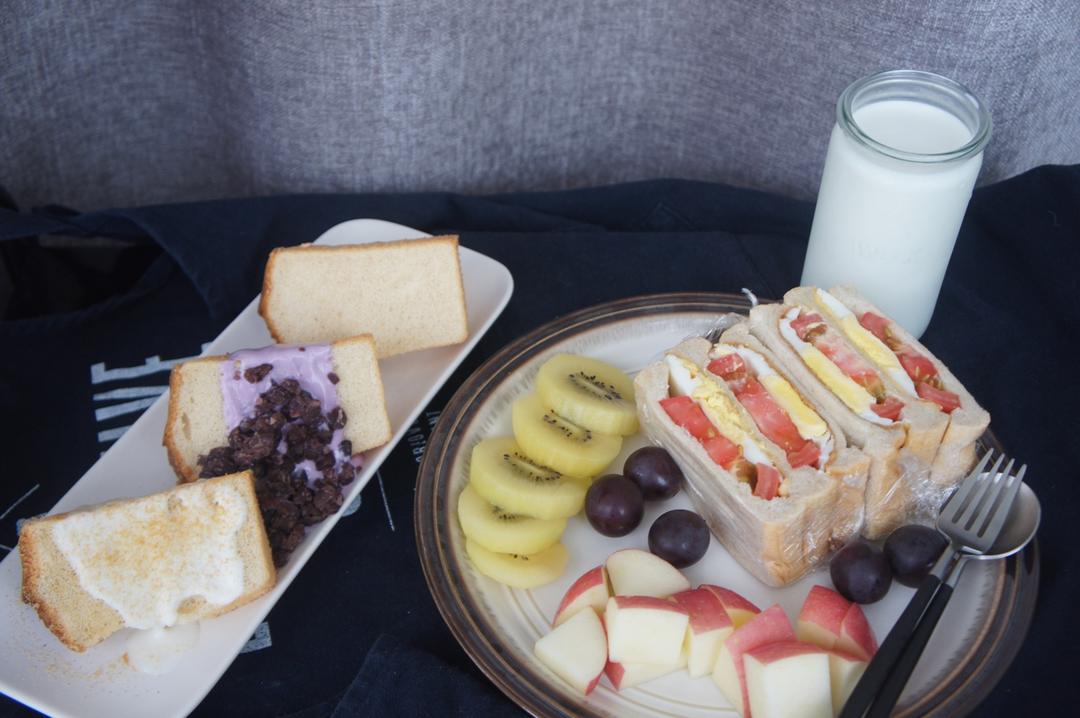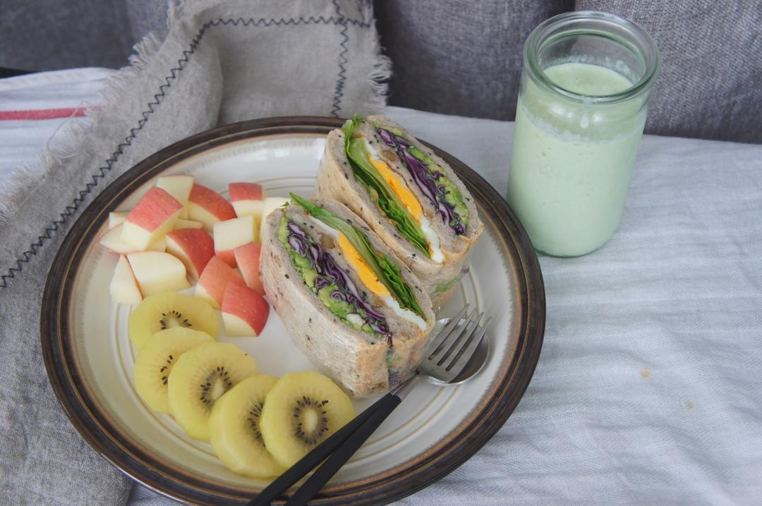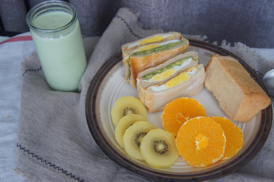 早安~牛油果奶昔,牛油果鸡蛋全麦三明治,黄豆粉戚风,水果~