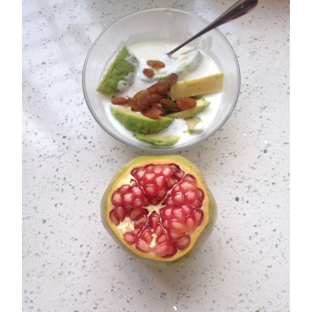 酸奶里加了牛油果葡萄干,前天超市买的石榴太惊喜了,酸甜多汁~一会再去拎几斤