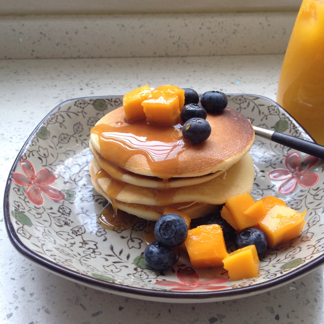 学做松饼,上色还不够均匀。松饼浇了焦糖奶油酱、芒果汁~