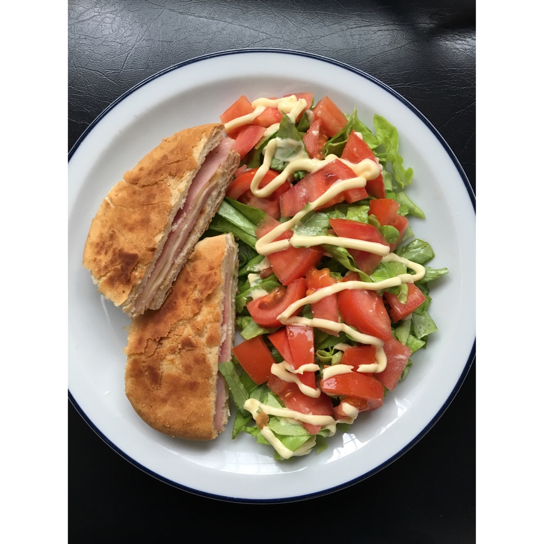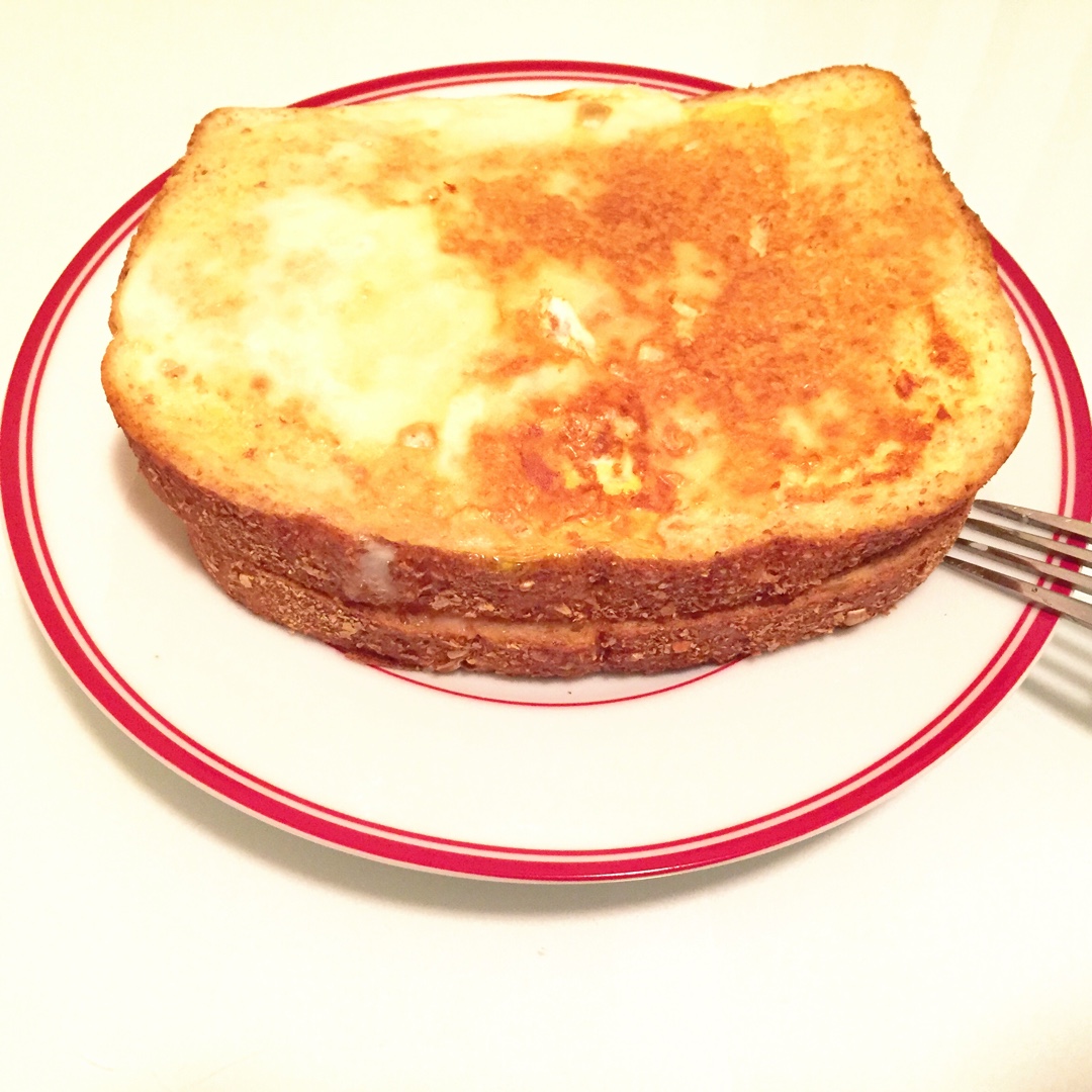 牛油果涂面包片,火腿煎蛋卷,以及大半杯都是牛奶的咖啡。