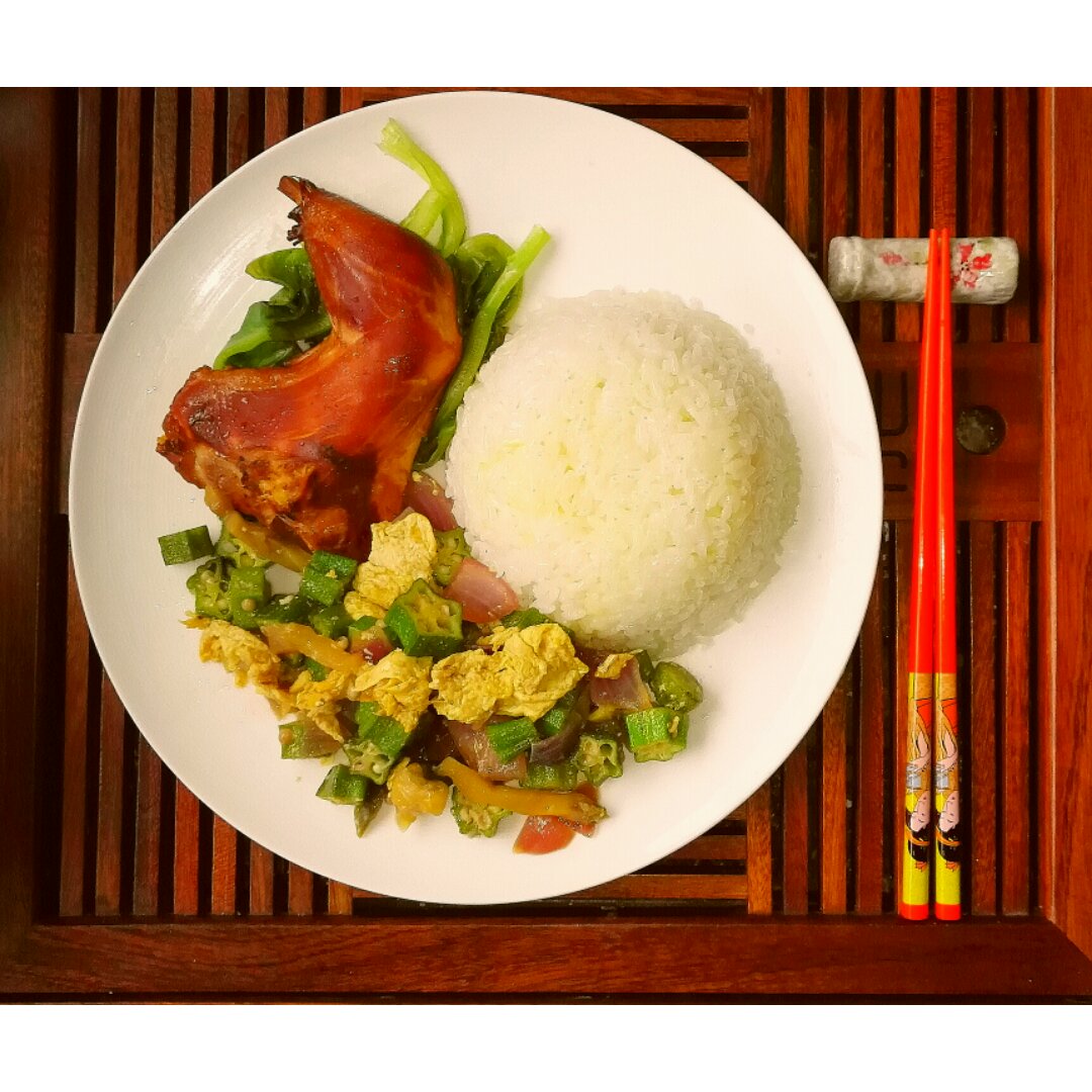 晒午餐:一盘K记熏乳鸽秋葵炒蛋盖饭