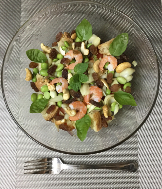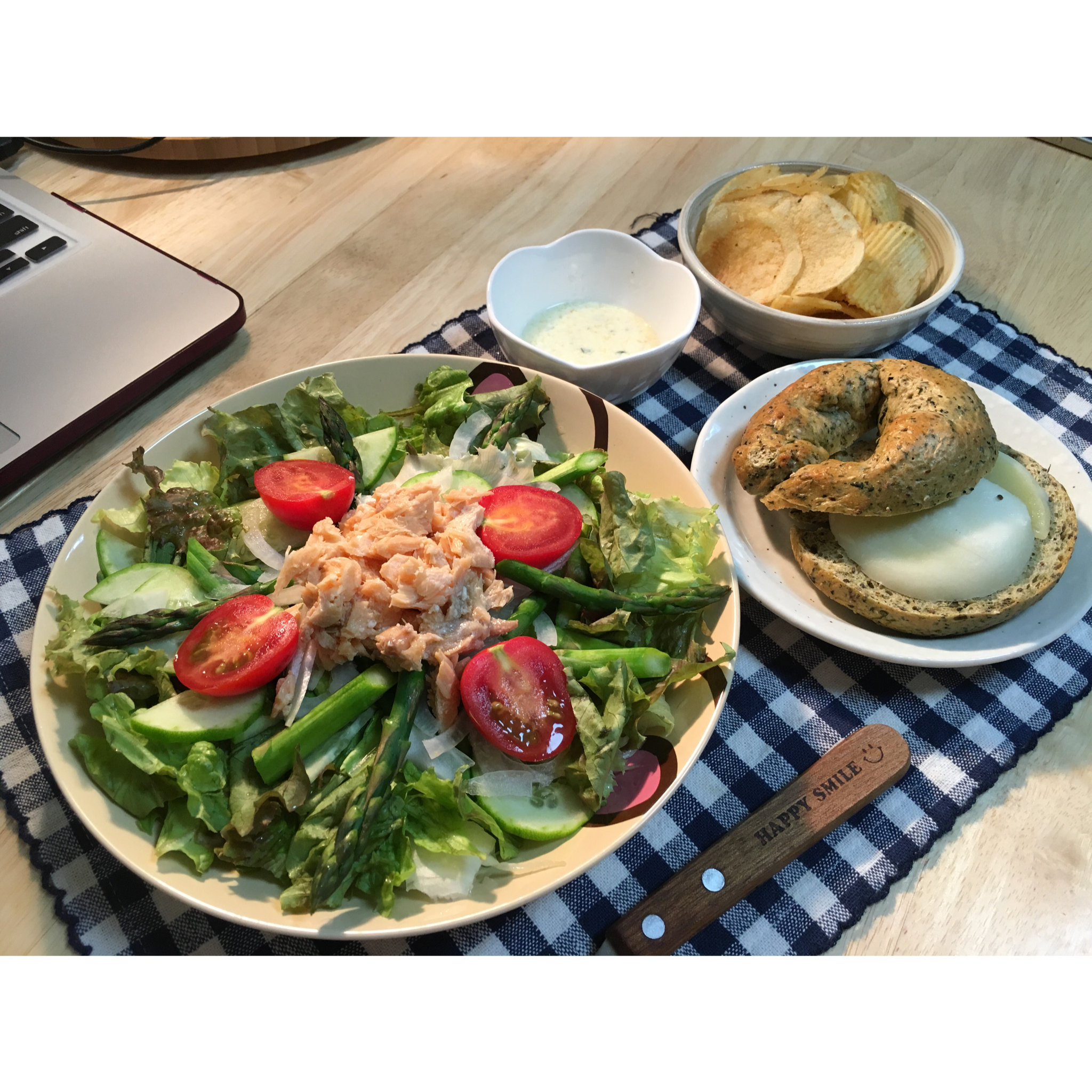 【芦笋三文鱼蔬菜沙拉配芥末美乃滋意式沙拉酱+薯片双拼+乳酪烤菠菜大豆贝果】