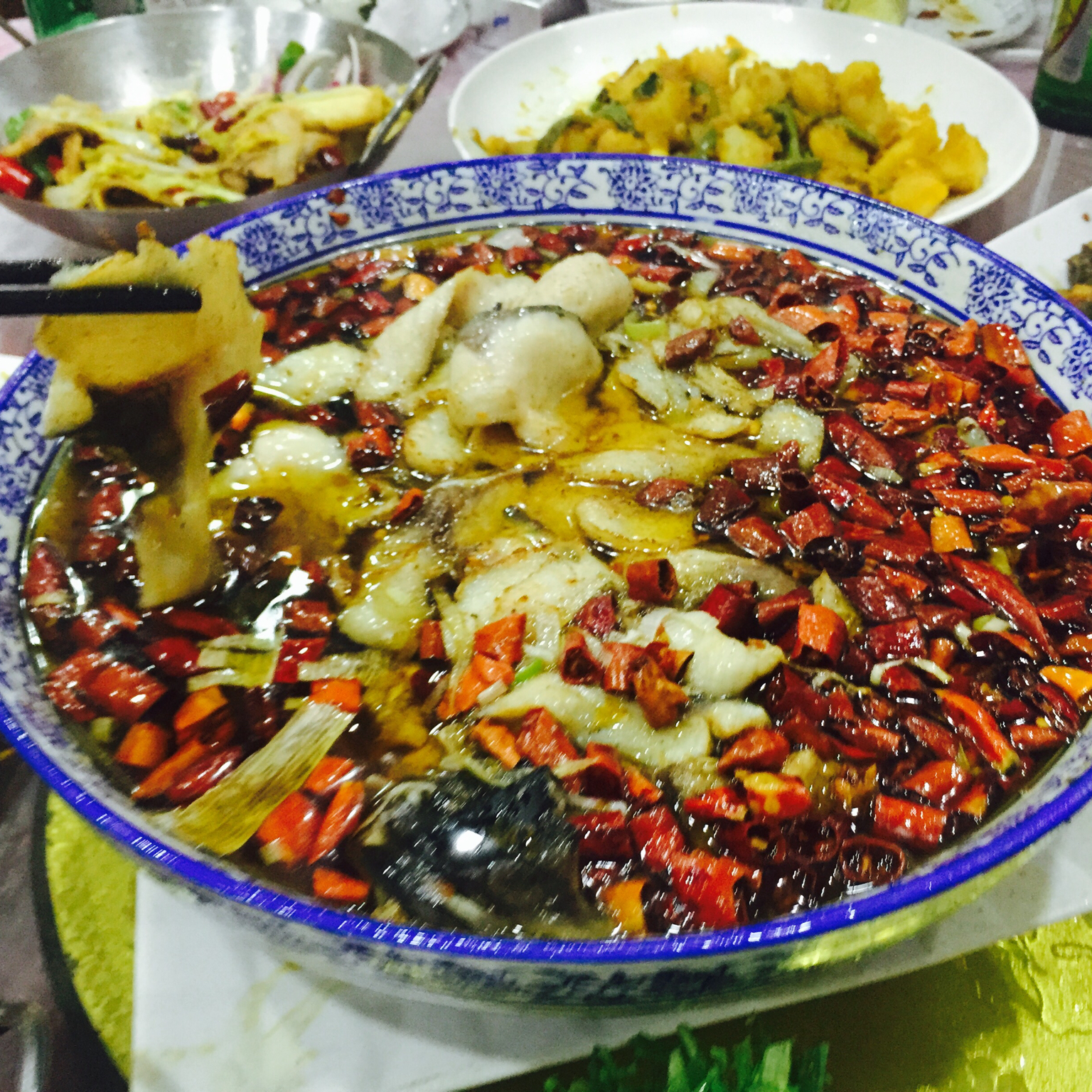 昨晚单位聚餐,马丫东北风味店的沸腾鱼,用草鱼做的微辣,鱼片很鲜很嫩很入味😍😍😍,最爱下面的豆芽儿、小青菜和香菜